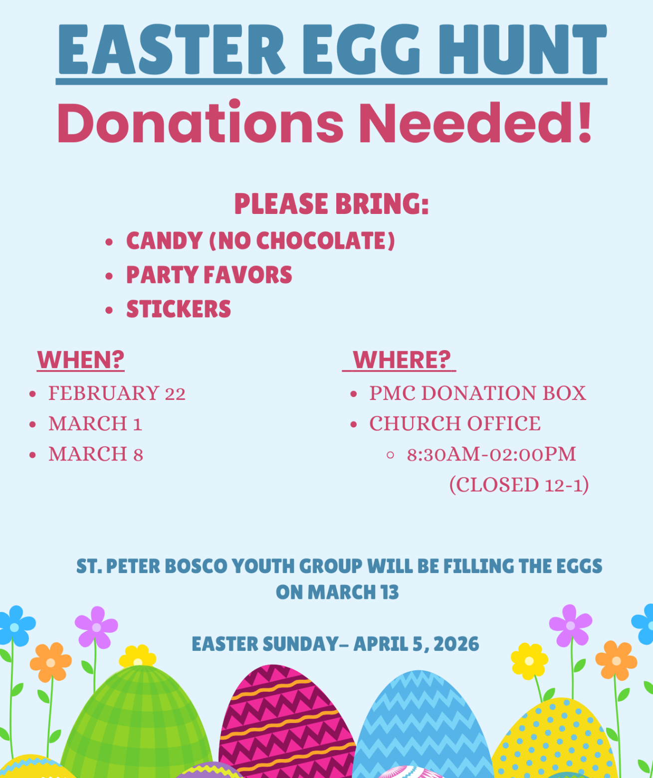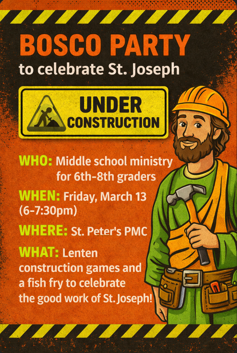 Blood Drive, March 11, 8:30am-12:30pmSt. Peter Catholic Church and Vitalant are hosting a blood drive in the PMC. Visit