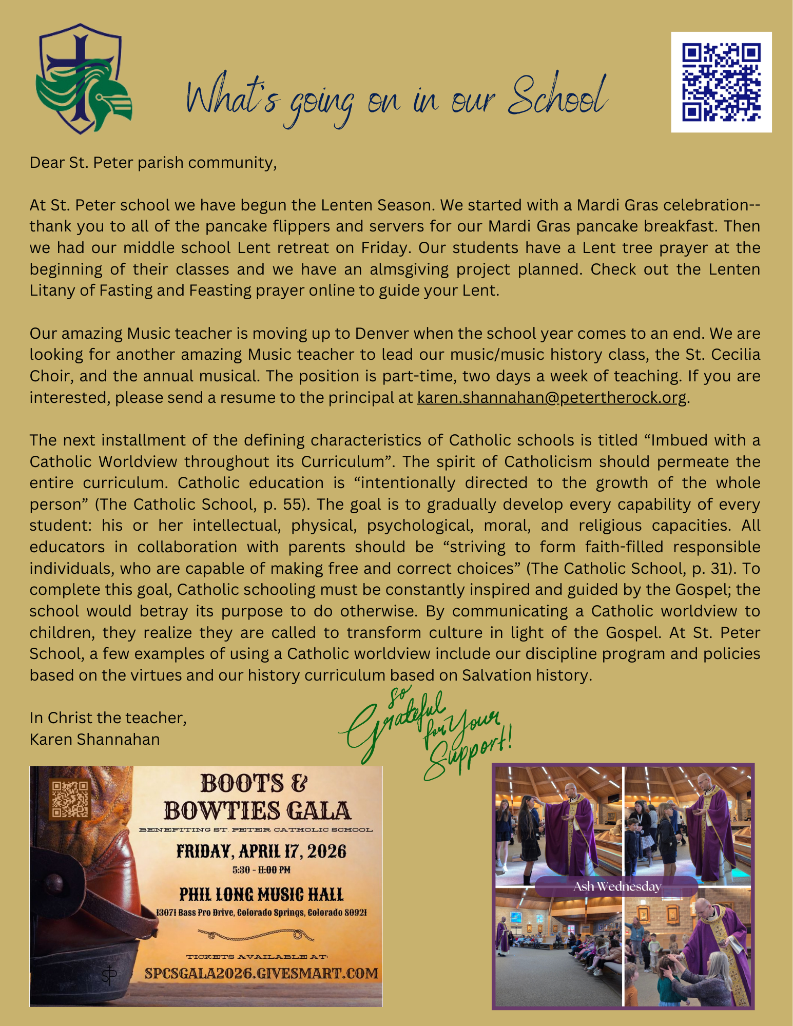 music teacher for the 2026-27 school year. Responsibilities of the music teacher include leading the music/music history classes, the St. Cecelia Choir, and the annual musical. The position is part-time (two days a week of teaching). If you are interested, please send a resume to Principal Karen Shannahan (