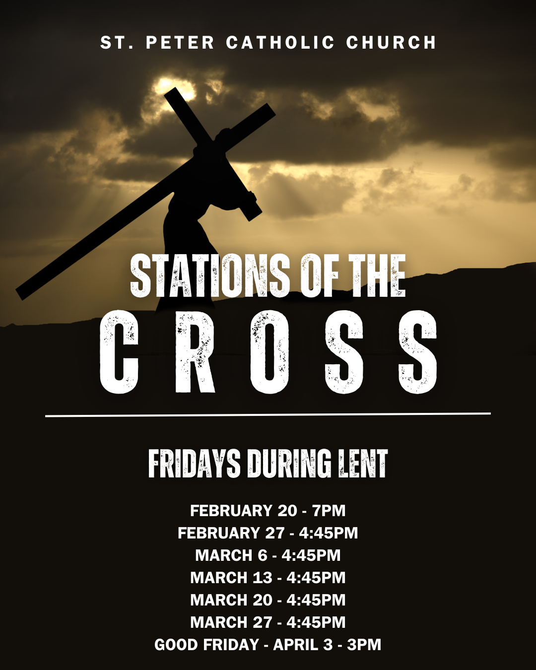Reconciliation will be available at 4:30pm and will continue through Stations. Living Stations, led by SPCS students.