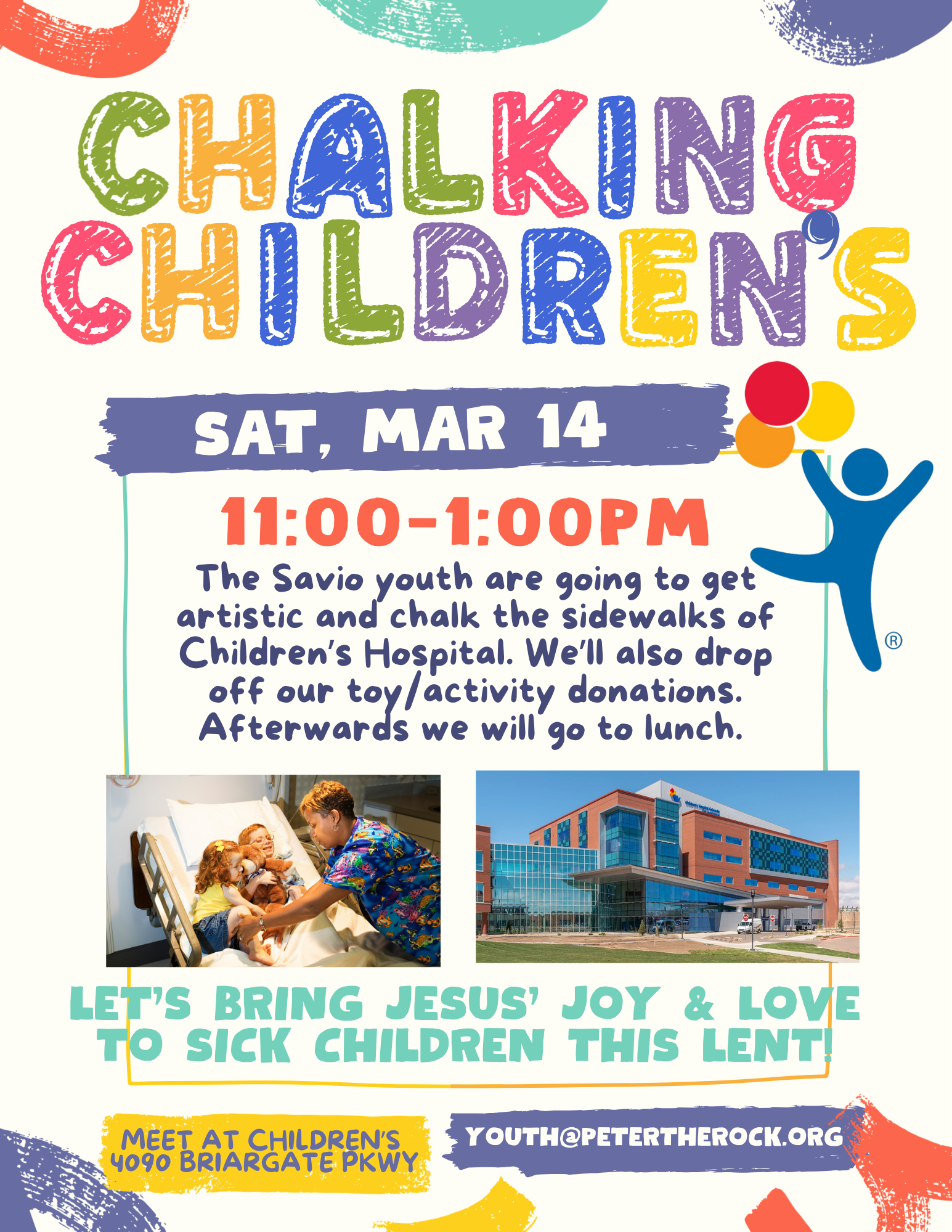 The Savio youth are going to get artistic and chalk the sidewalks of Children's Hospital. The group will get lunch afterwards. Meet at Children's (4090 Briargate Pkwy.). Additional details above. Contact Sr. Jackie Sardina (