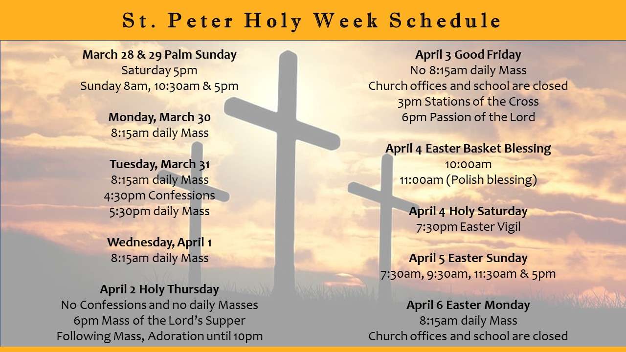 Easter Lilies in Memory of Loved OnesRemember a loved one - those who have gone from us, and those who are still enriching our lives - through a memorial gift of Easter lilies. The flowers will adorn the church on Easter Sunday. The cost is $20 per plant. Please make your check payable to St. Peter Church and put “Easter lilies” and the name of the person you wish to honor in the memo section. Please place your order no later than Thursday, March 26.